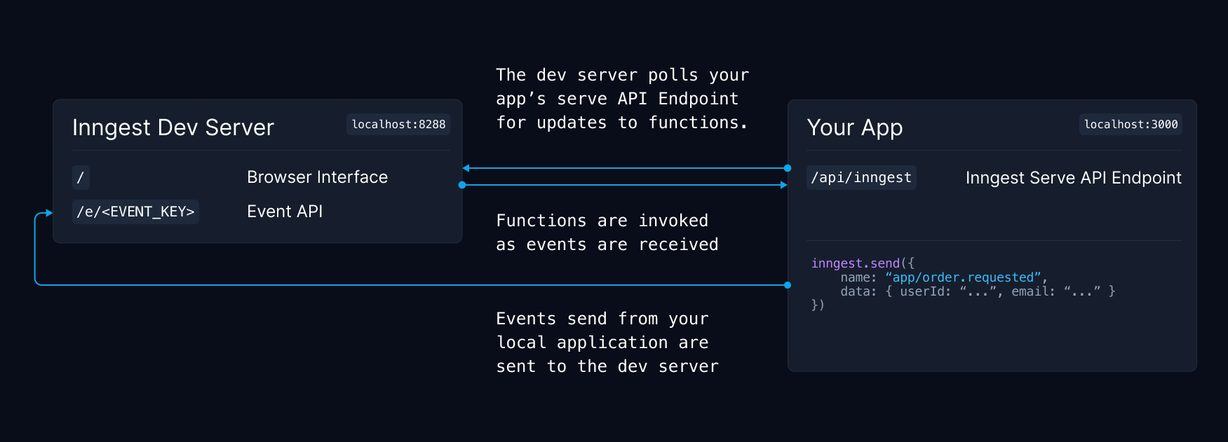 The dev server polls your app locally for any new or changed functions. Then as events are sent, the dev server calls your functions directly, just as Inngest would do in production over the public internet.