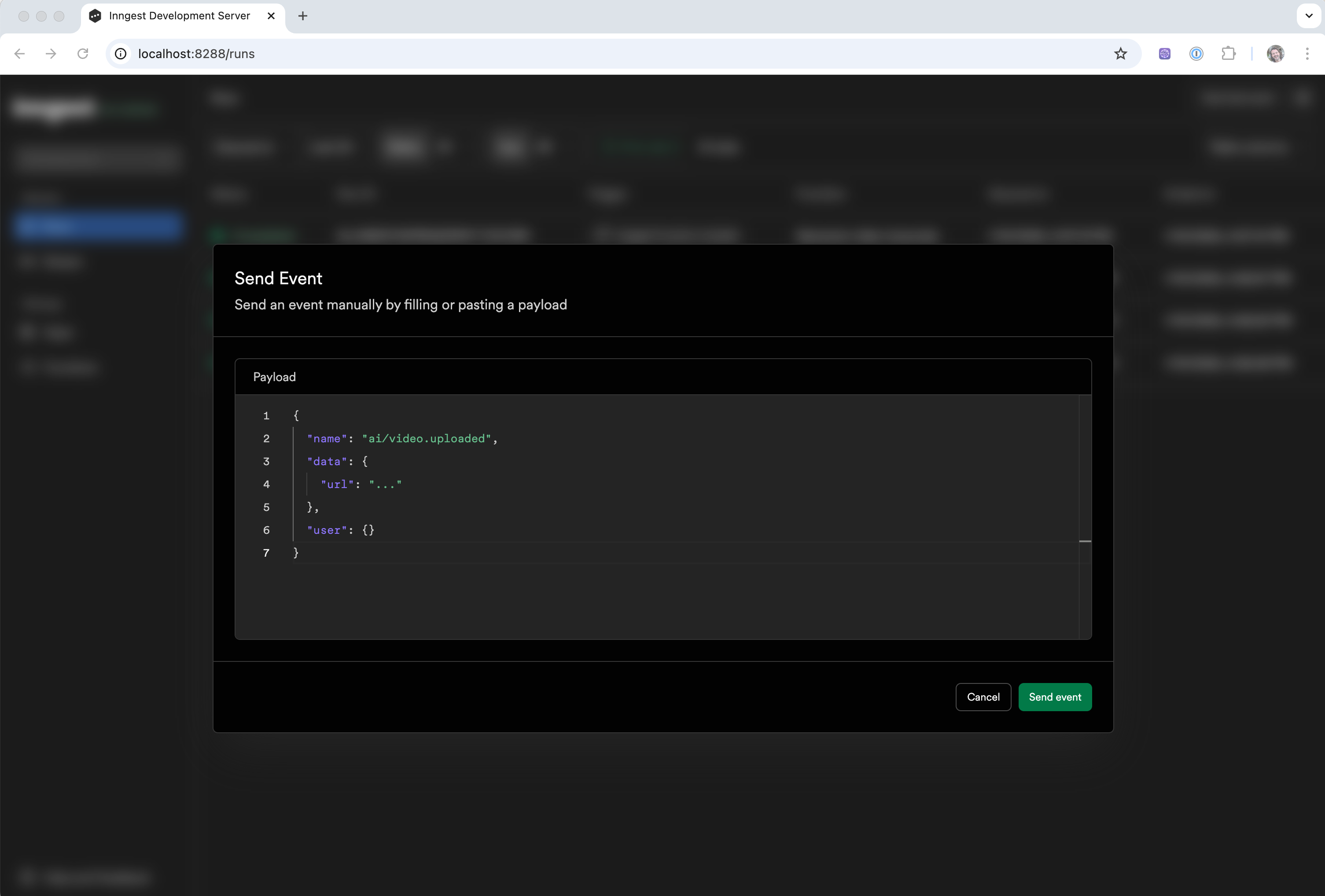 The dev server's interface also has a "Test Event" button on the top right that enables you to enter any JSON event payload and send it manually. This is useful for testing out different variants of event payloads with your functions.